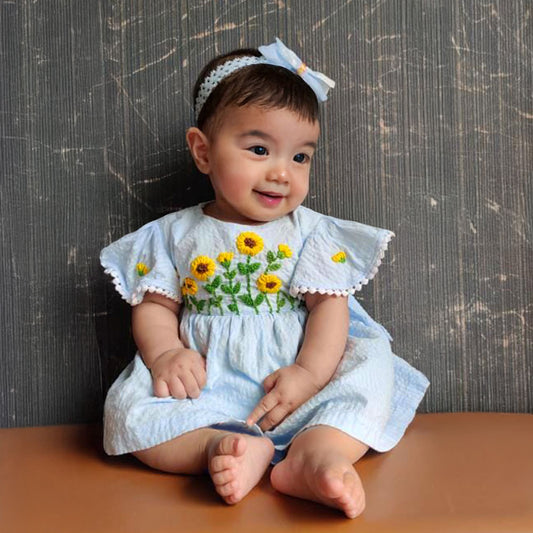 Organic Cotton Embroidered Girls Blue Dress - Sunflower
