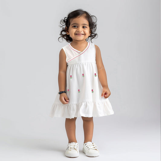 Keebee Organic Cotton Hand-Embroidered Girls White Dress - Tulips
