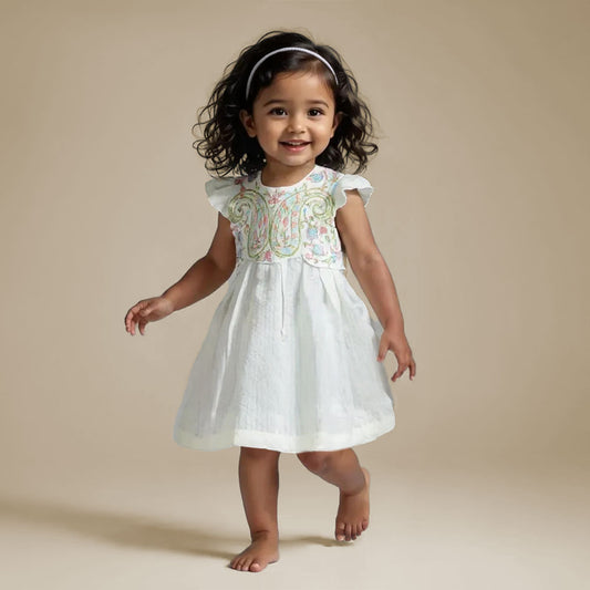 Keebee Organic Cotton Textured Embroidered Girls White Dress with Cap Sleeves - Paisley