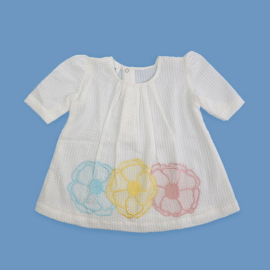 Keebee Organic Cotton Textured Puff Sleeve Embroidered Girls Dress - Flowers