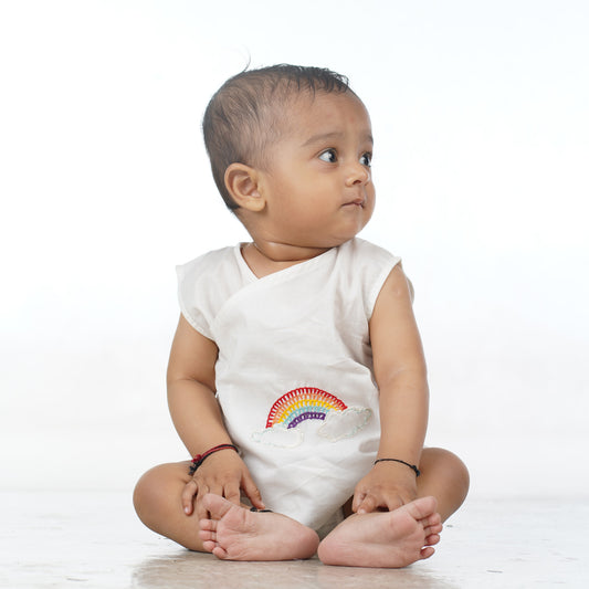 Organic Cotton Sleeveless Hand Embroidered Baby White Jabla - Rainbow