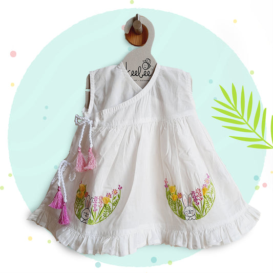 Keebee Organic Cotton White Embroidered Girls Jabla / Wrap Dress - Rabbit