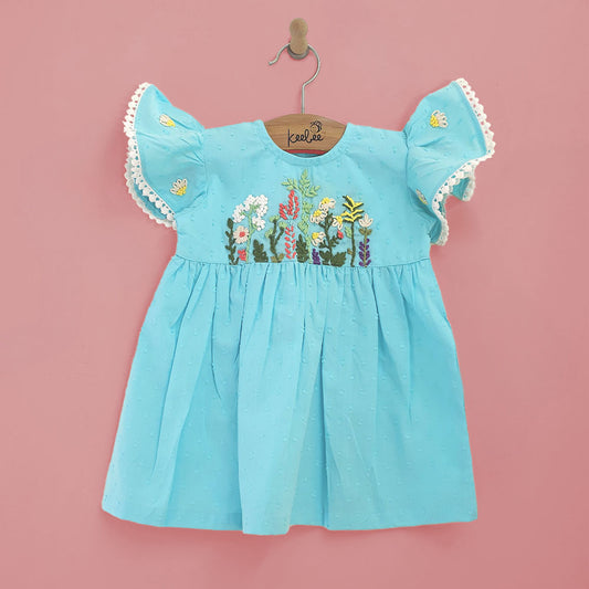 Keebee Organic Cotton Embroidered Girls Light Blue Dress - Flower Garden