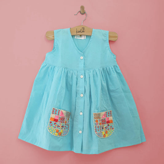 Keebee Organic Cotton Hand Embroidered Turquoise Blue Baby Girl Dress with Pockets
