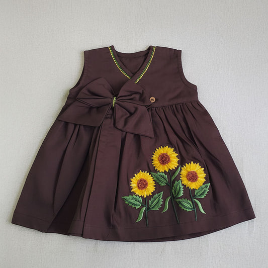 Keebee Organic Cotton Embroidered Girls Brown Overlap Dress - Sunflowers