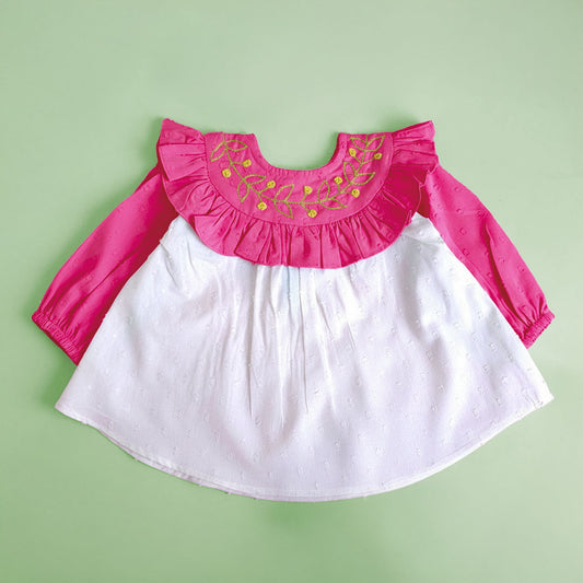 Keebee Organic Cotton Baby Girl Embroidered Hot Pink and White Dress and Accessories Set - Garland of Flowers