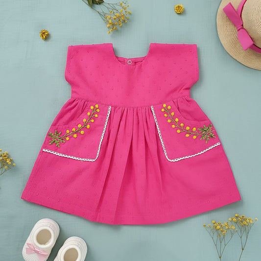 Keebee Organic Cotton Embroidered Girls Hot Pink Pocket Dress - Yellow Flowers