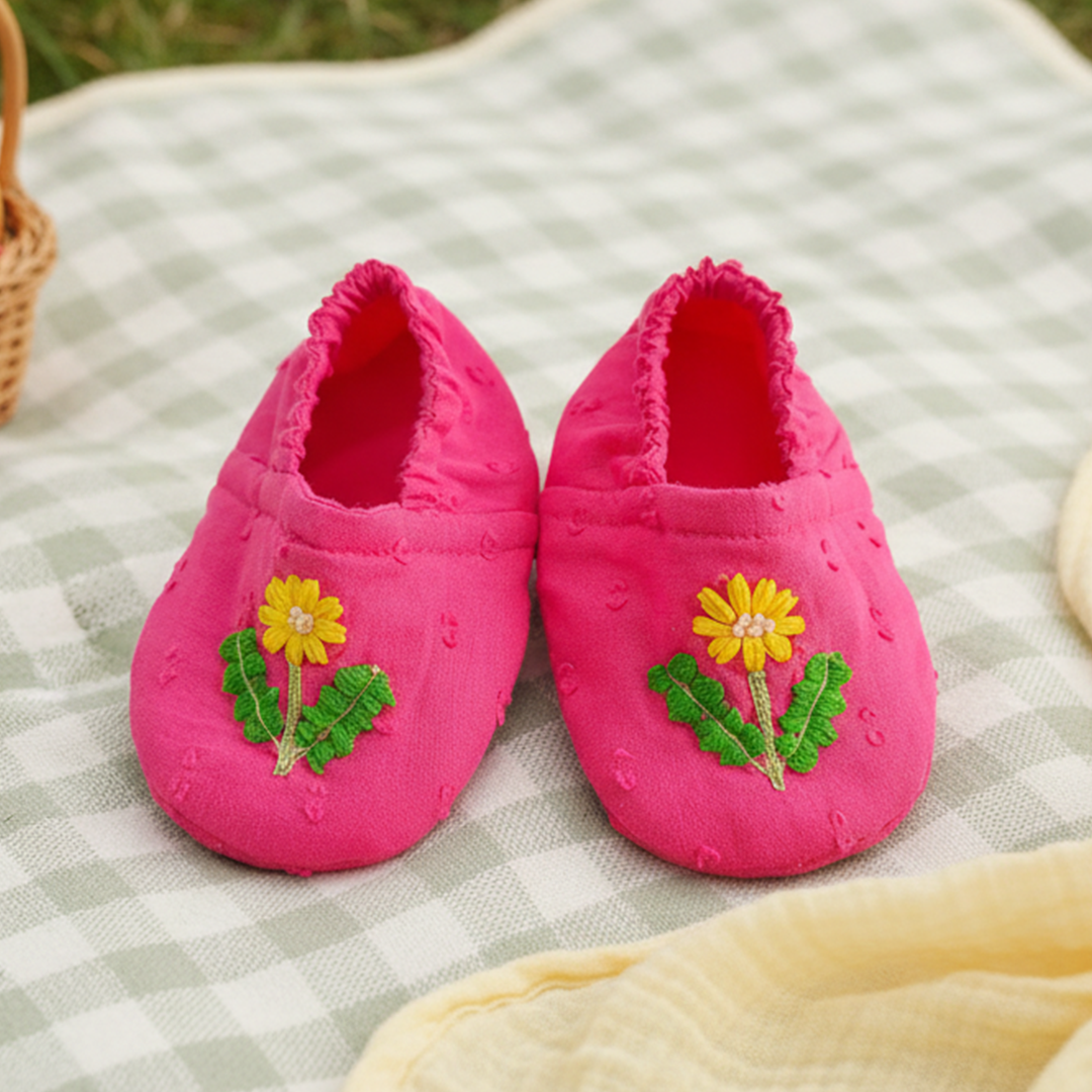 The highlight? Charming embroidered yellow blooms on the skirt, finished with ruffles at the hem and yellow piping detail on the puff sleeves. The matching embroidered headband and padded baby shoes complete the look, both featuring gentle elastic for a secure yet soft fit.