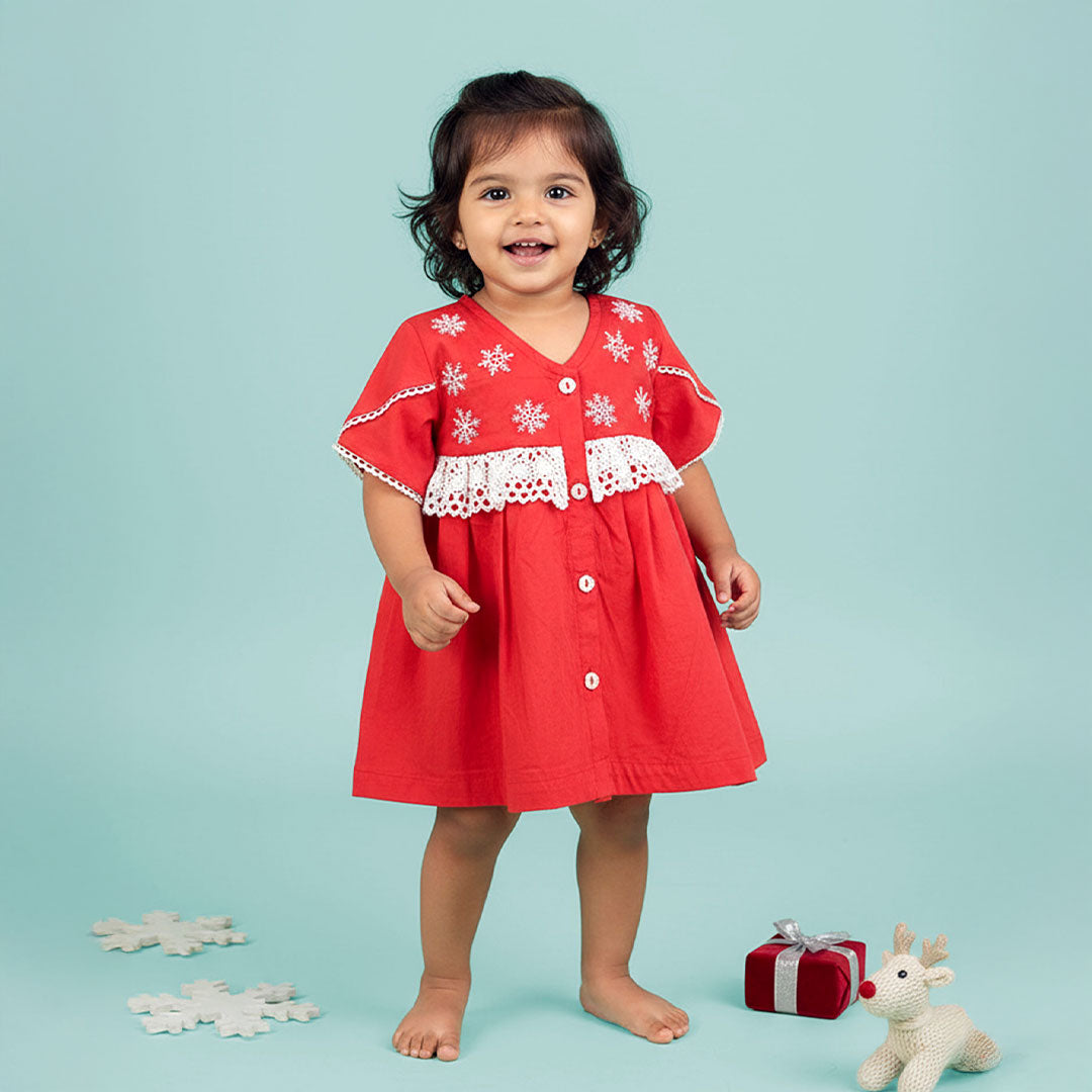 Drift into winter wonderland in this dress made from GOTS-certified organic cotton fabric! The cherry-red dress features delicate snowflake embroidery dancing across the yoke, complemented by vintage-inspired white lace trim. Dainty petal sleeves and charming flower-shaped shell buttons add the perfect nostalgic touches to this festive piece.