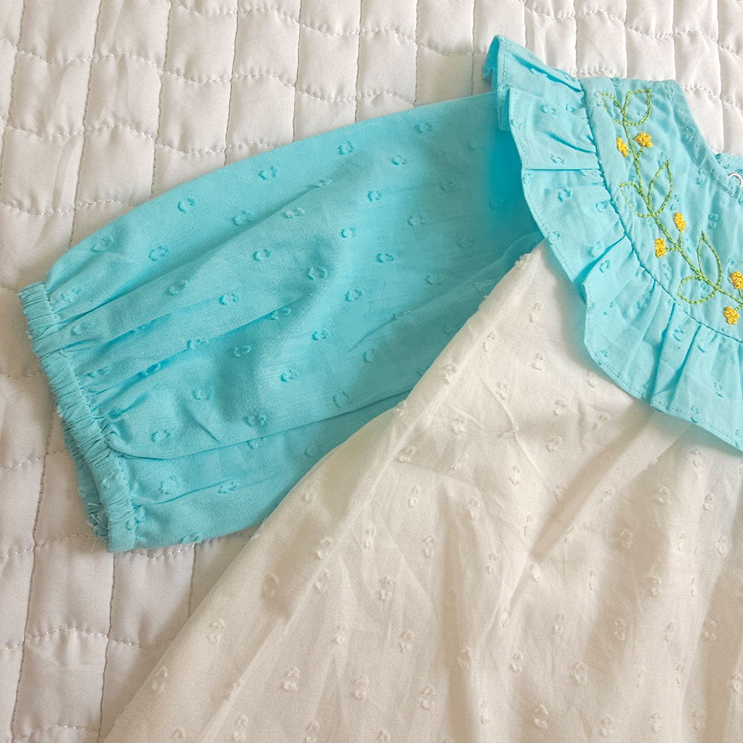 baby girl dress, organic cotton dress, floral embroidered baby dress, turquoise baby dress, breathable baby outfit, swiss dot dress for kids, soft baby festive wear, easy to wear baby clothing, cute baby clothing, natural baby clothing, organic kids outfit, organic cotton babywear, comfy baby girl outfit, toddler winter dress