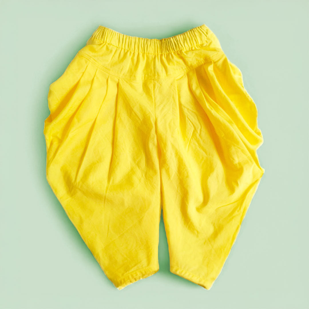 It comes paired with bright yellow dhoti pants that are diaper-friendly and finished with a gentle elastic waist, giving your little one plenty of room to move, stretch, and relax.