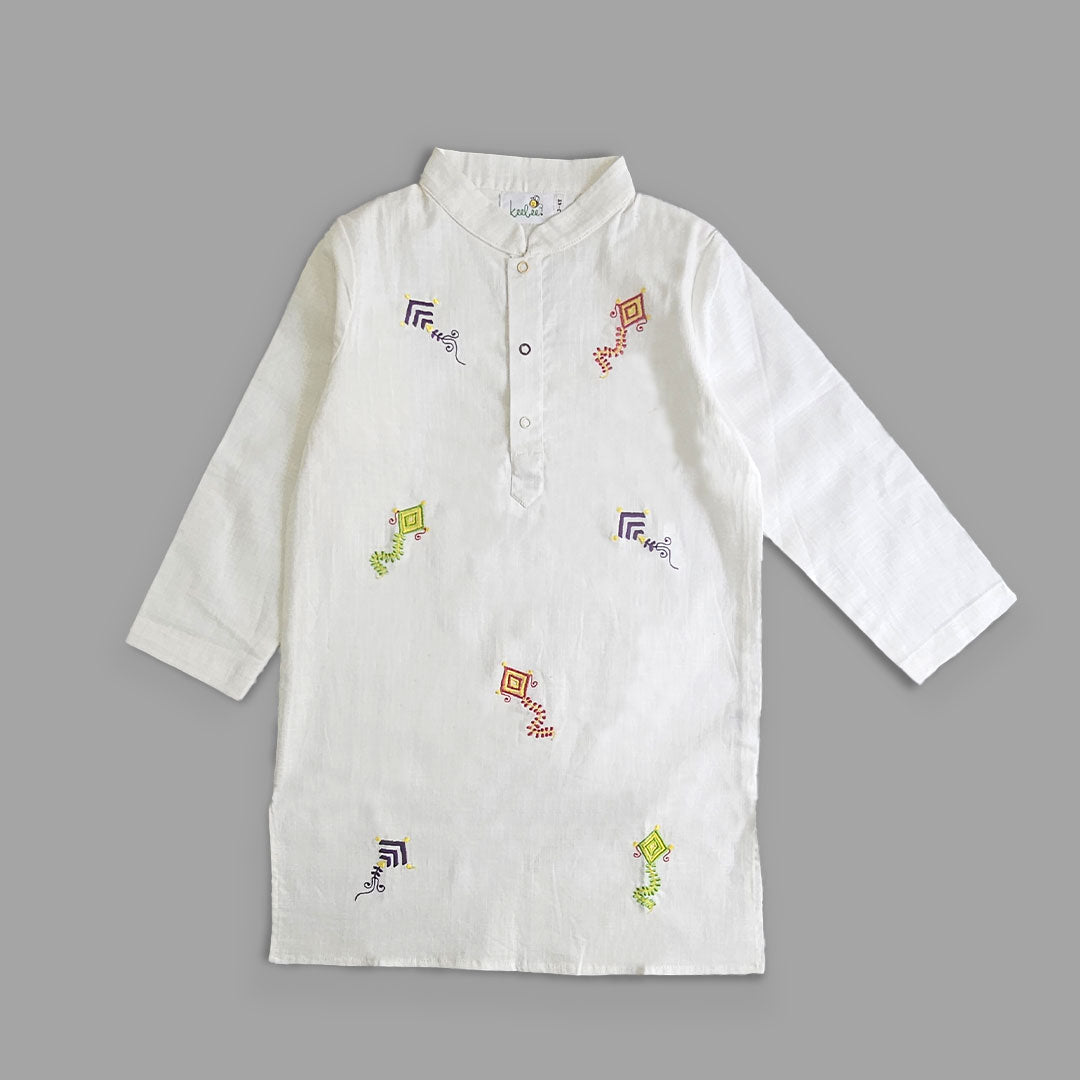 Style up your next celebration with this white kurta set, with beautiful kites embroidery and coordinating pants.