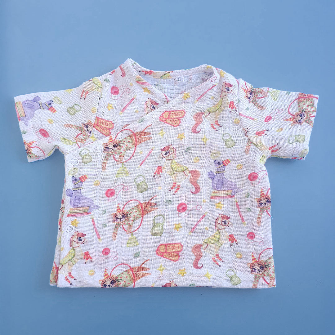 This wrap-style jabla set is crafted from airy, double-layer Organic Cotton muslin, keeping babies cool and comfortable. The playful print features adorable circus horses, cats, and seals performing joyful acts across the fabric.