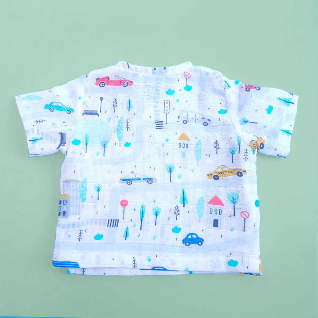 Made from soft, breathable Organic Cotton muslin, this double-layer wrap-style jabla set brings a lively little town to life. The half-sleeve jabla top comes with snap-button closure and an all-over print of roads, buildings, and vehicles to spark tiny imaginations.