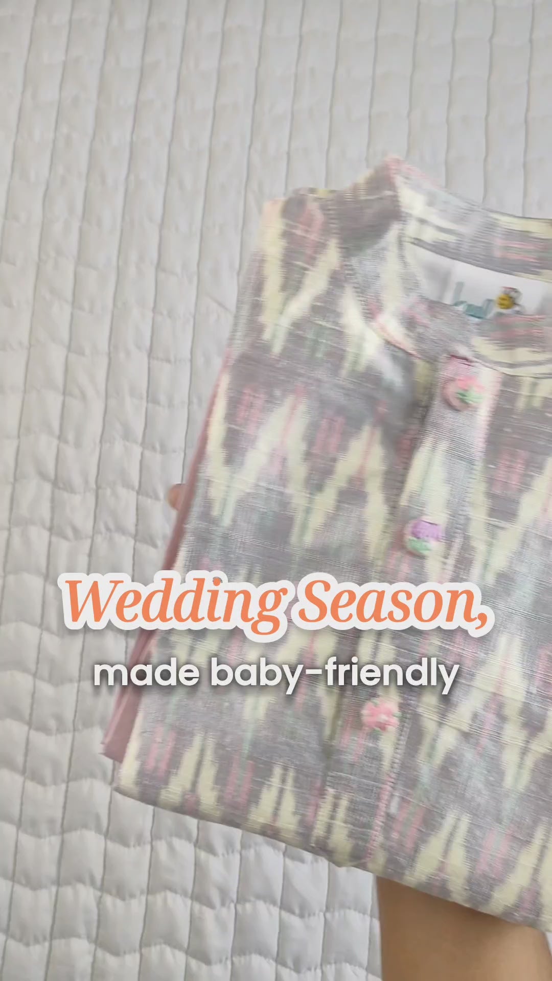 It’s finished with baby pink silk pants for a soft festive pairing. For babies under 1 year, diaper pants are included, while pajama pants are provided for older kids.