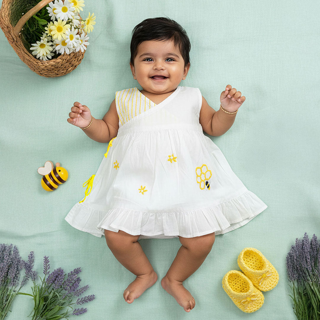 [ honeybee baby dress, honeycomb embroidery frock, organic cotton jabla, hand embroidered kids dress, white wrap dress for girls, cute nature theme dress, breathable cotton frock, sleeveless organic cotton baby dress ]